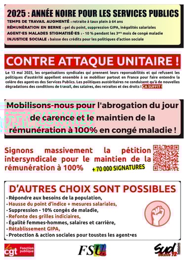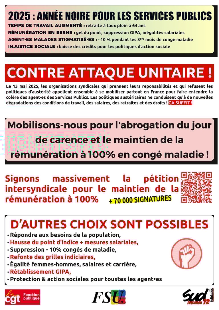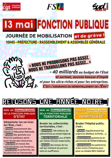La CGT, la FSU et Solidaires appellent à une journée de mobilisation et de grève le 13 mai, avec rassemblement à 10h45 devant la préfecture suivi d’une assemblée générale. L’objectif : faire entendre la colère, refuser les sacrifices imposés et défendre une autre vision du service public.